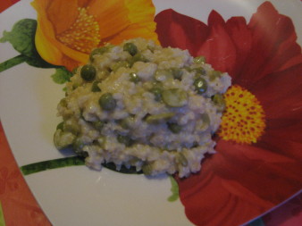 Ajouter le riz aux oignons et bien remuer. Ajouter les pois et les fèves. Ajouter un verre de vin blanc sec et une louche de bouillon de légumes. Faire mijoter.